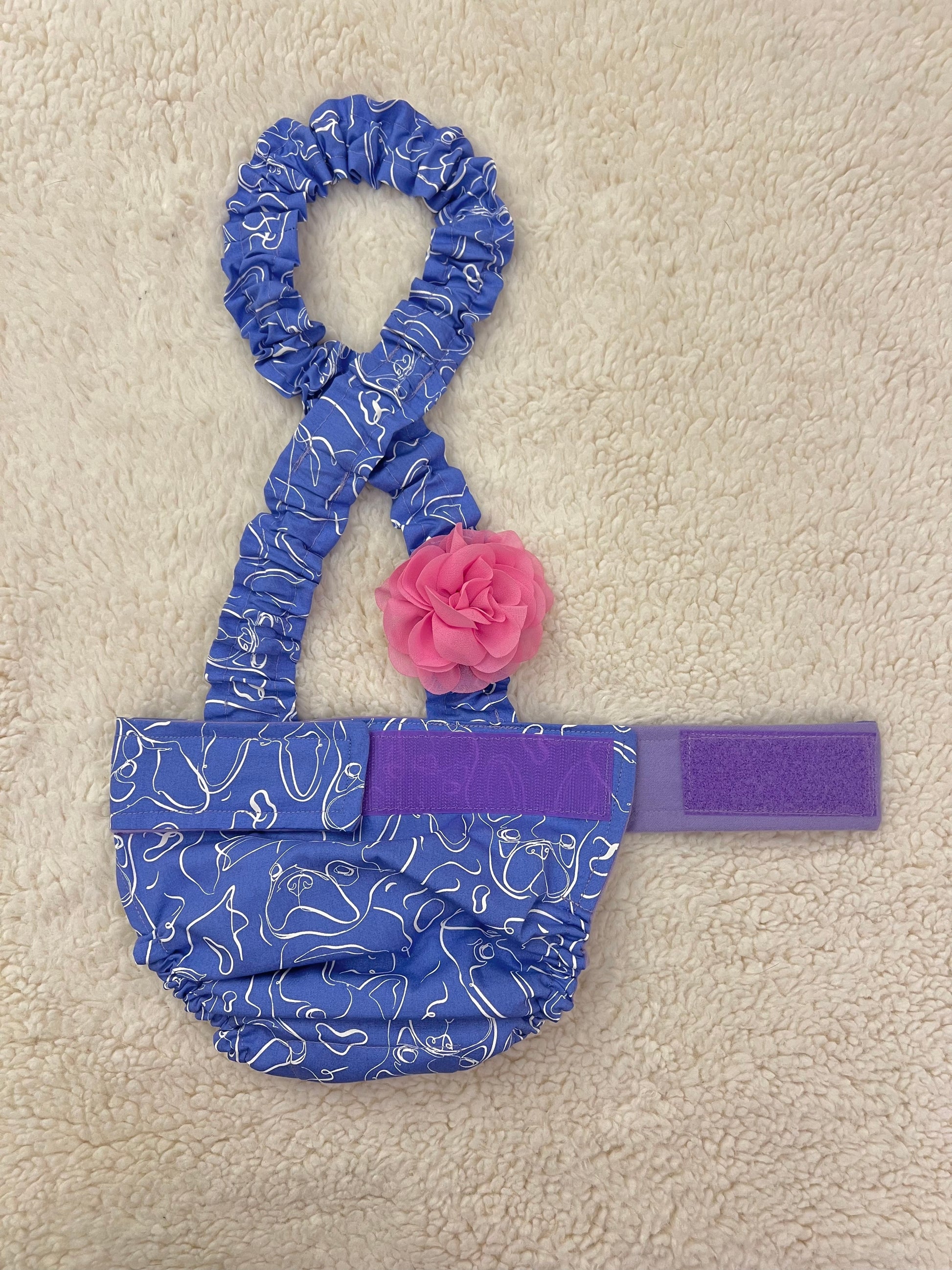 Our Female English or French Bulldog or Boston Terrier Heat Diaper is handmade and comes highly recommended! Diapers have no tail hole. I use elastic in the suspenders and Hook and Loop around the waist so they are adjustable and will fit your adult female Bulldog comfortably. Everyone loves how these diapers stay on their dogs! Escape proof!