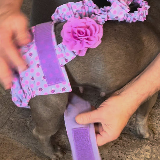 Our Female English or French Bulldog or Boston Terrier Heat Diaper is handmade and comes highly recommended! Diapers have no tail hole. I use elastic in the suspenders and Hook and Loop around the waist so they are adjustable and will fit your adult female Bulldog comfortably. Everyone loves how these diapers stay on their dogs! Escape proof!